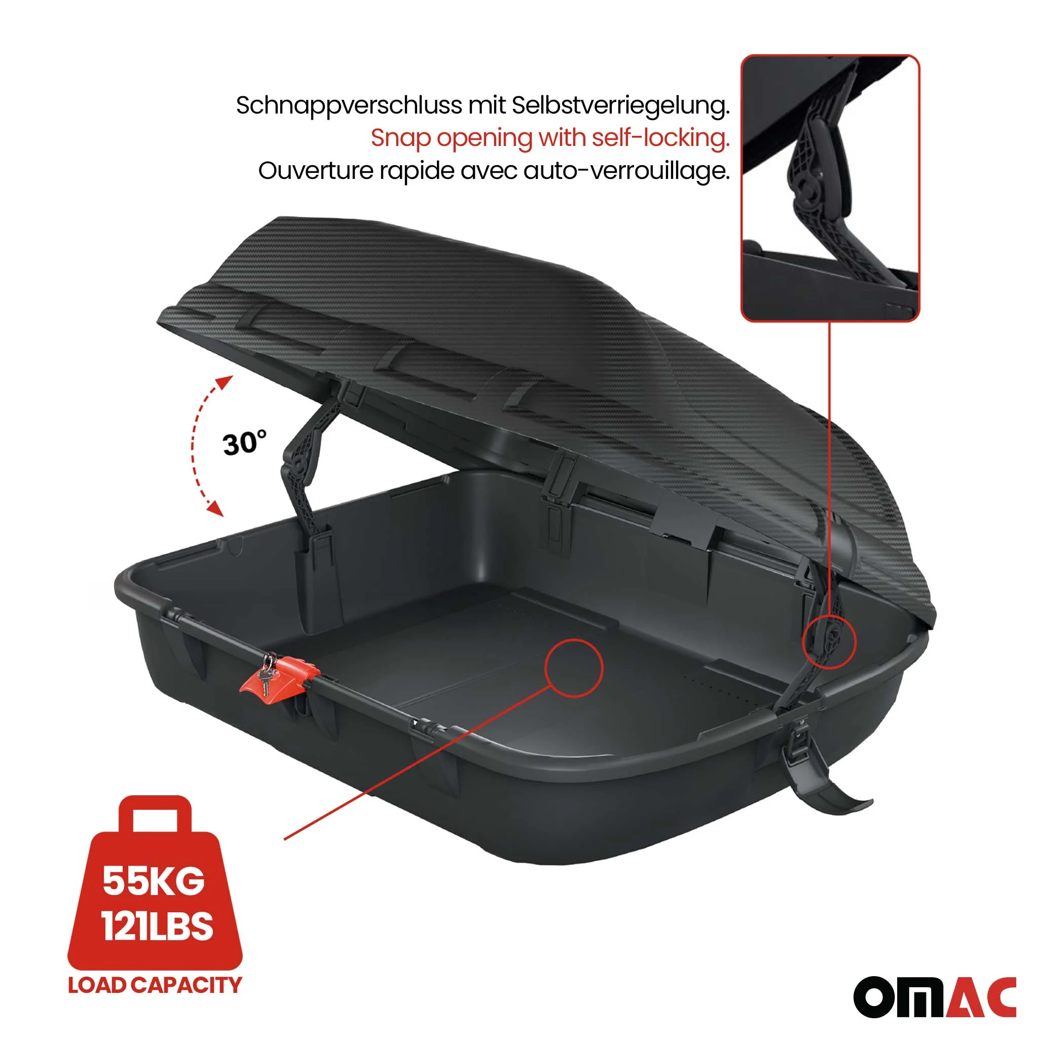 Die Dachbox ist TÜV-zertifiziert und für eine maximale Traglast von 55 kg ausgelegt.